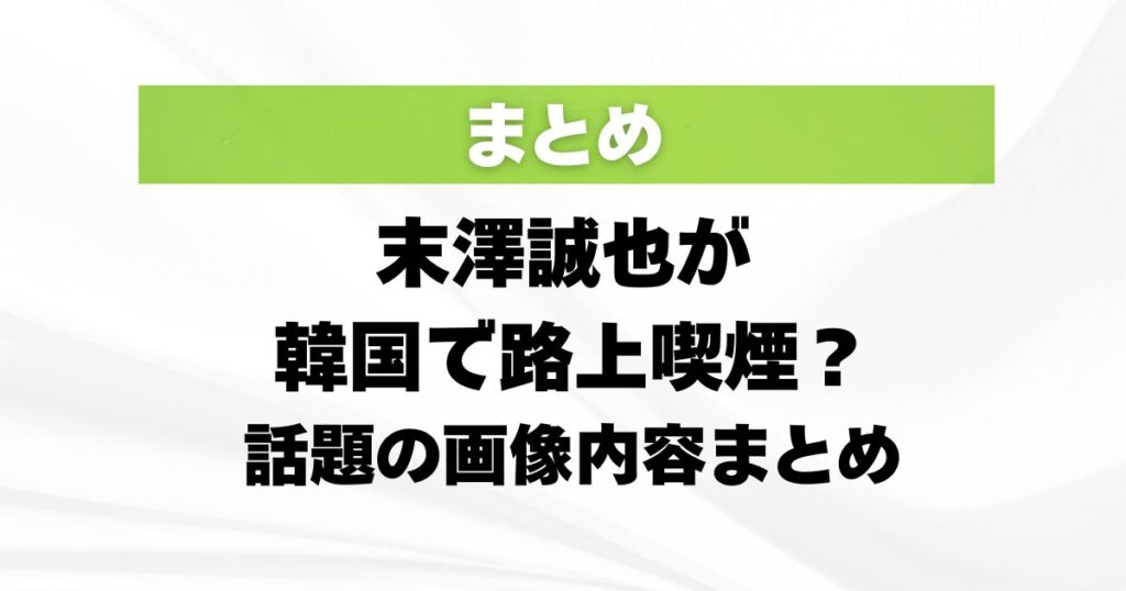 末澤誠也さんの名前が急に広がっています。 きっかけは、韓国での路上喫煙ではないかとする投稿でした。 画像もあわせて拡散されていて、実際に何が写っていたのか気になった人も多かったはずです。 今回は、話題になった投稿の内容と画像の見え方、韓国で... -